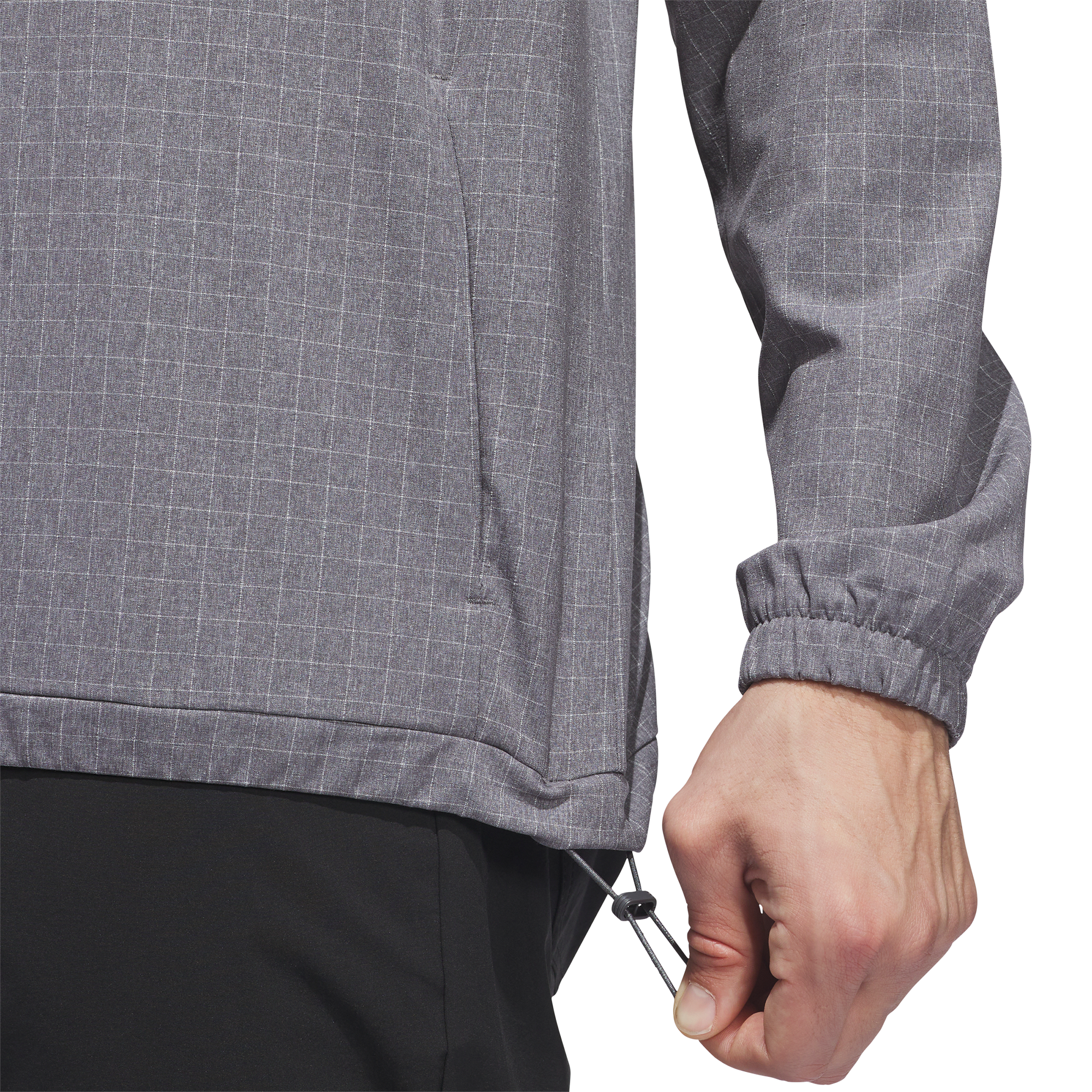 Garment has front pockets, elastic cuffs, and a bungee-adjutable hem, all in a style with a light grid pattern.