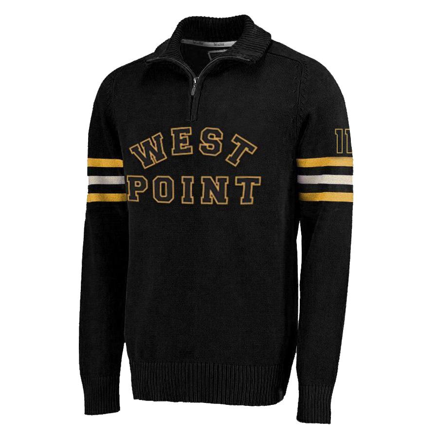Designed exclusively for the WPAOG Gift Shop, this sweater features many of the same elements found on the Lombardi sweater: three stripes on sleeve, Chenille letters spelling West Point across the body, and a partial zip front.