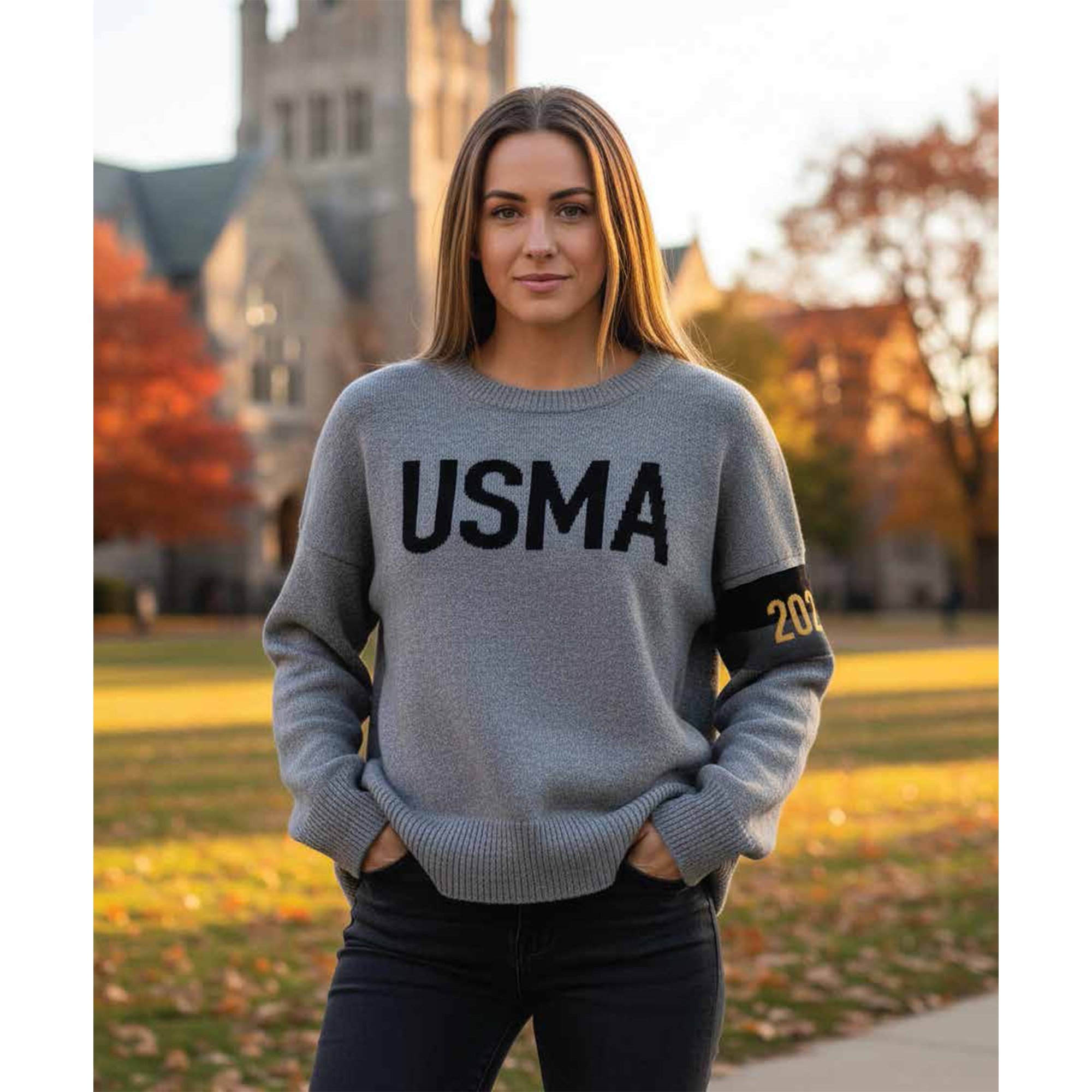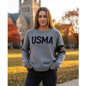 Designed exclusively for the WPAOG Gift Shop in a ladies' fit, this sweater features a knit-in arm band with embroidered class year on top. Chest art is USMA knit in as well.