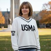 Fuzzy intarsia knit sweater with USMA across the chest. Drop shoulders in an oversized, 100% nylon-knit style that is super soft and cozy. The sweater runs large. Order one size down for a more traditional fit. Model is 5'2' and is wearing a small. Sweater has WPW50 on sleeve to celebrate the 50th anniversary of women at West Point. Sizes XS-2XL.