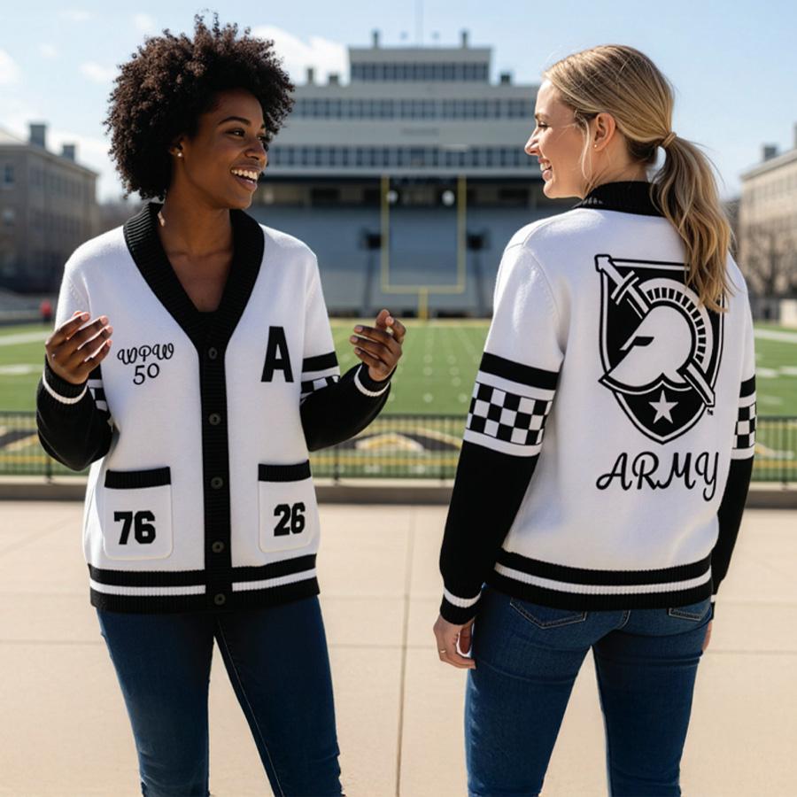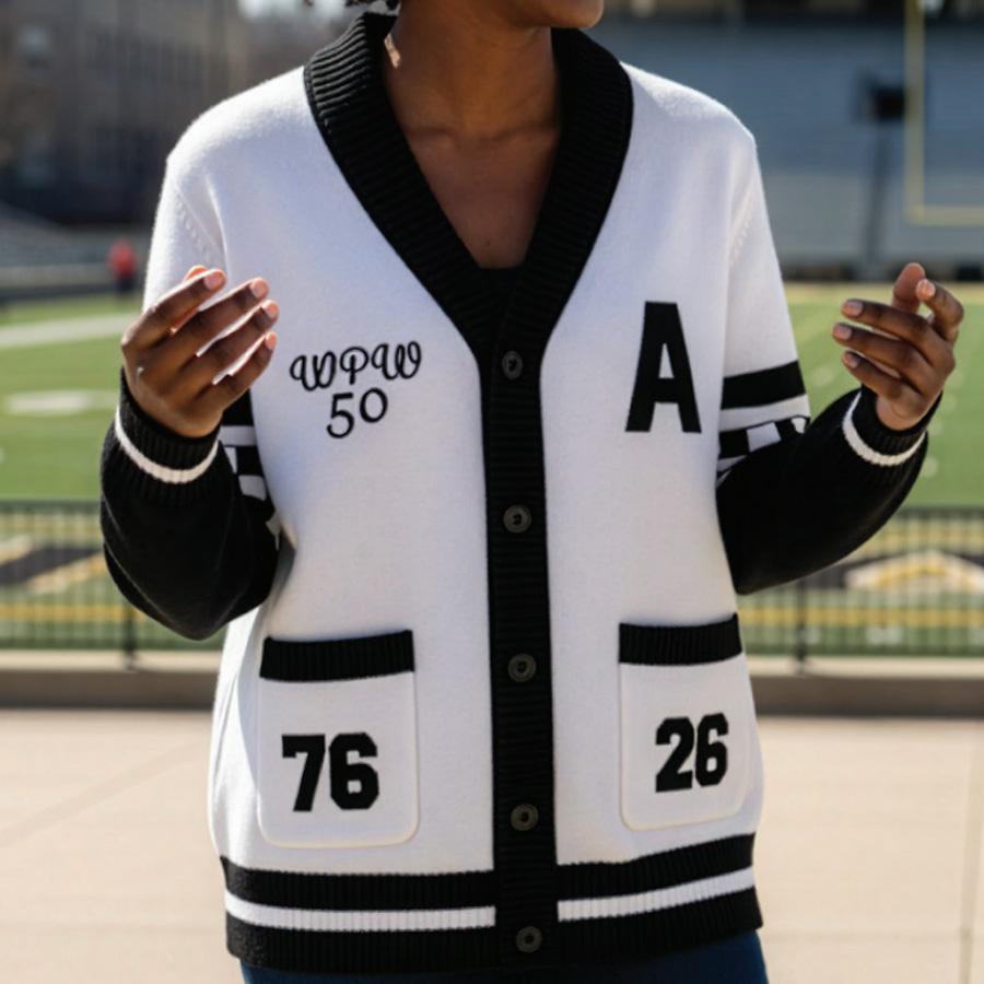 The cardigan is part of the pre-order for the WPW50 celebration in April 2026. All orders will ship ahead of the event. Please select 'ship-to' at checkout. All custom orders are final sale. Please review the size chart below before ordering and call the store if you have sizing questions (800-426-4725).