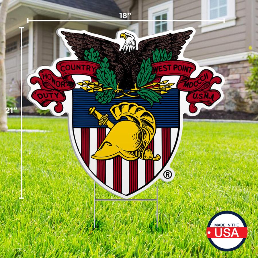 Celebrate your child's nomination, graduation, Founder's Day or any West Point occasion with our USMA Crest yard sign. Measures 18x21 inches. Made of a sturdy corrugated plastic. These signs can get wet. Our yard signs are made in the USA and ship directly from the vendor to your home or business. Please allow 3 weeks to process, produce and ship