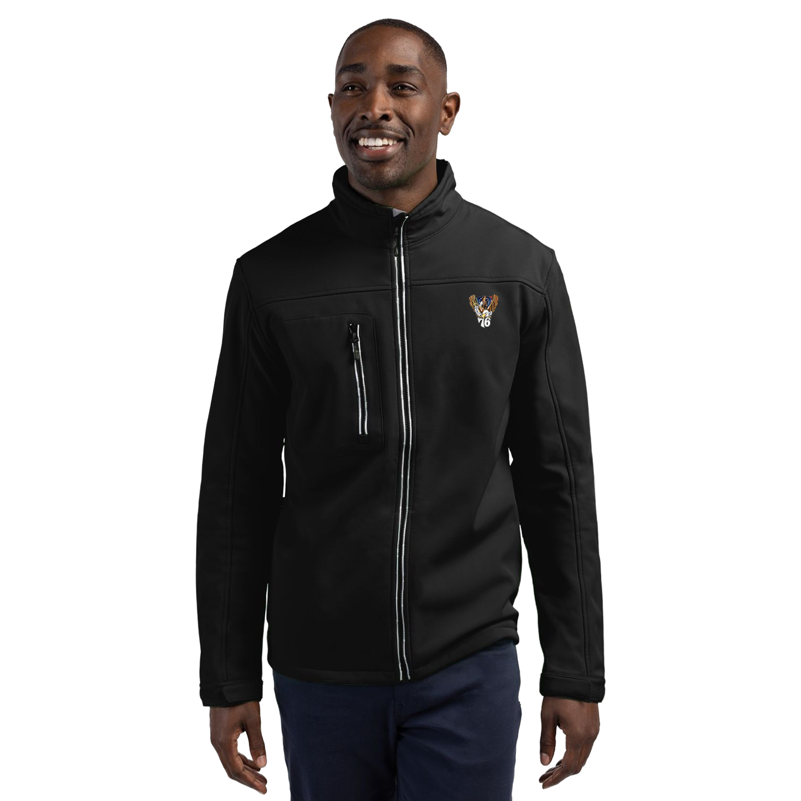 A softshell, lightweight jacket in a recycled polyester. Every day wear in a sporty, water-resistant style. Inner lining is a soft microfleece. Zip pockets at chest and side pockets on-seam. Contrasting zippers. Your choice of class crest or Athletic Shield over 1976. Sizes S-4XL. Also available in a vest (R88976).