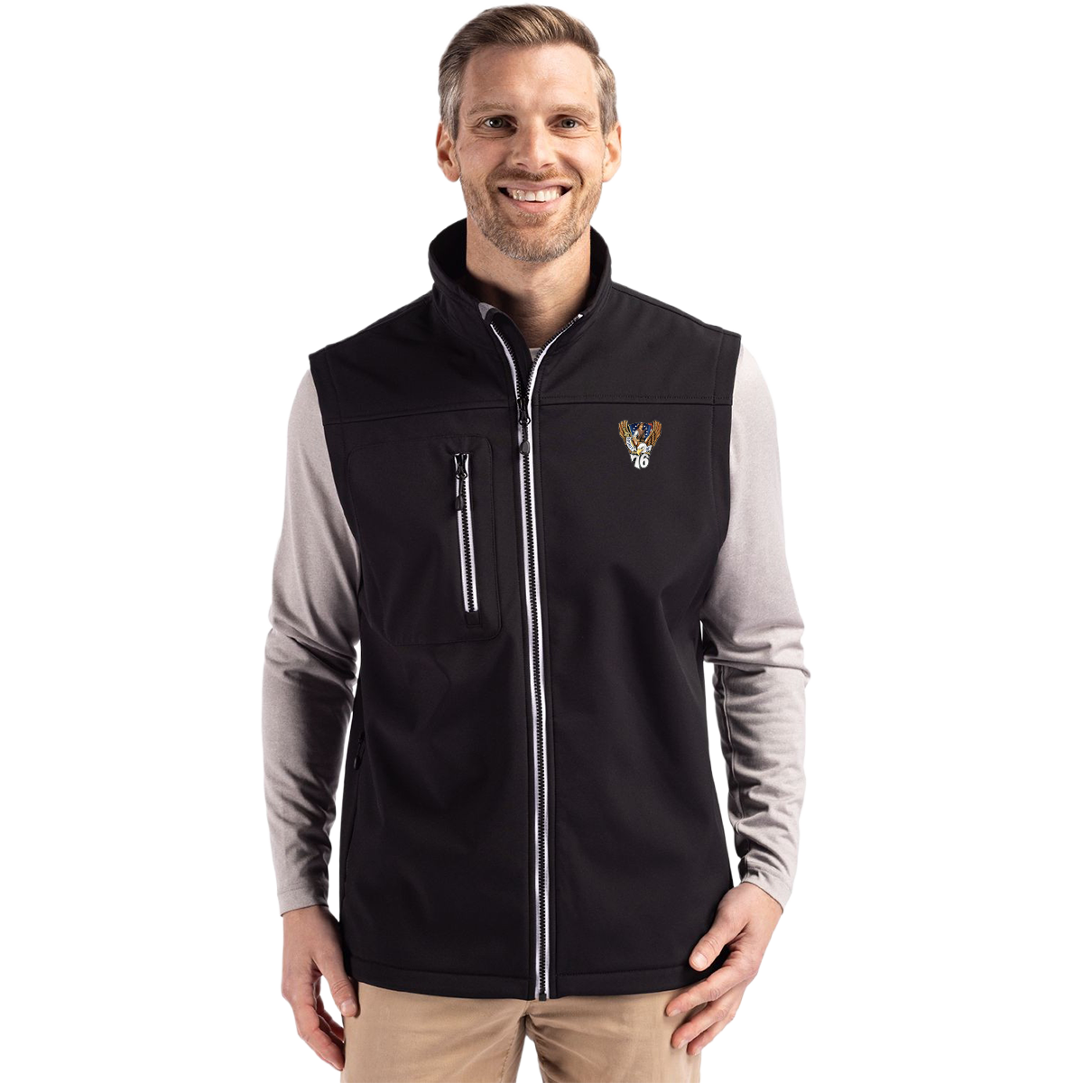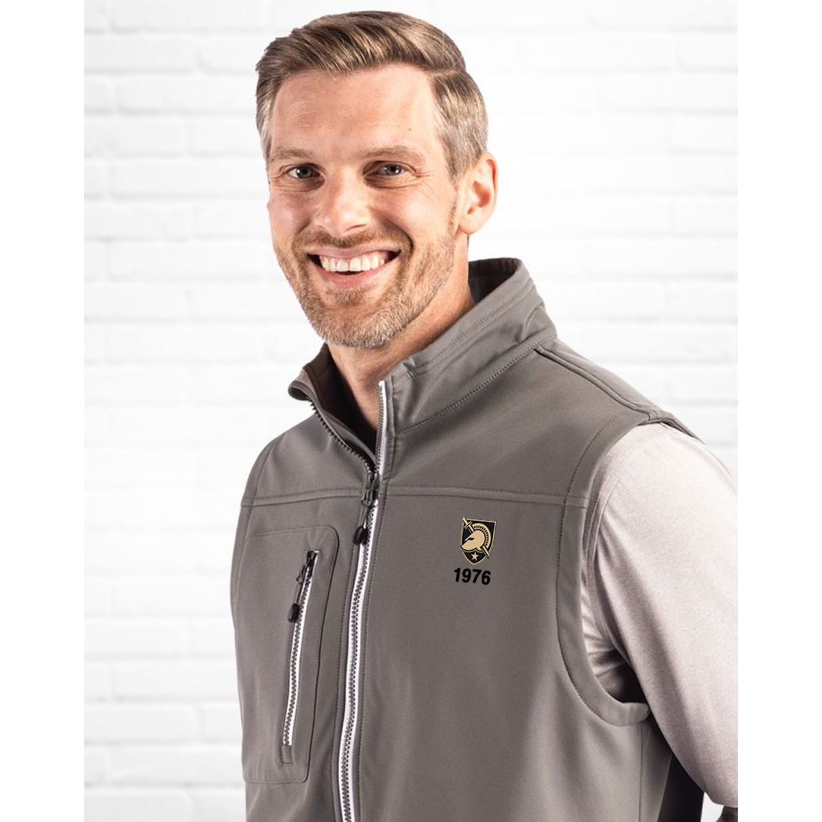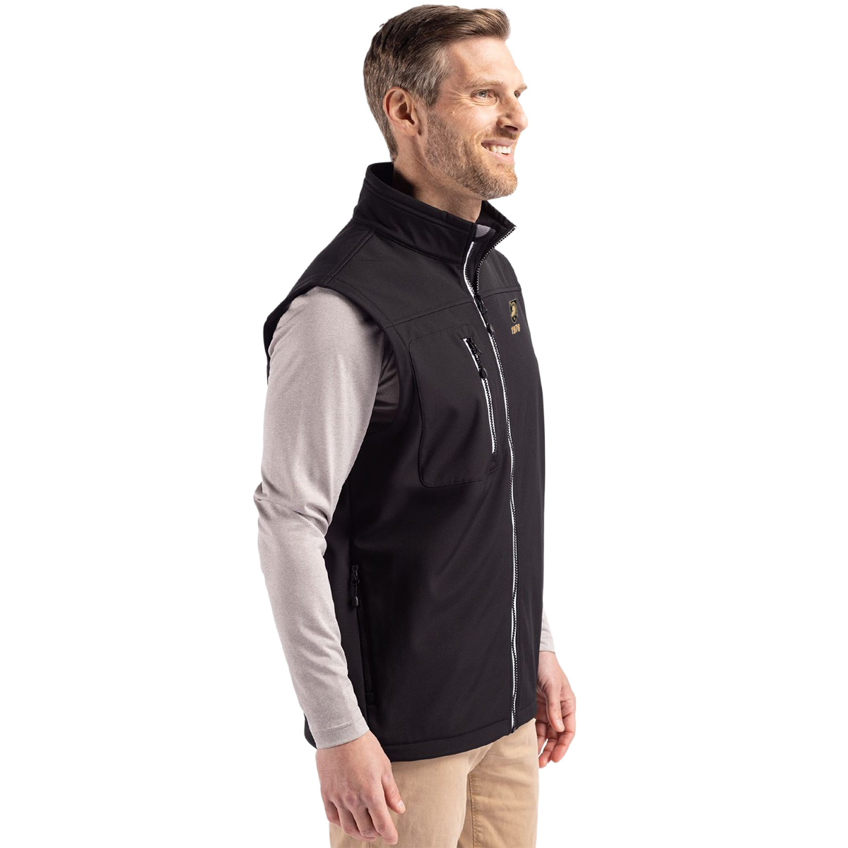 A softshell, lightweight vest in a recycled polyester. Every day wear in a sporty, water-resistant style. Inner lining is a soft microfleece. Zip pockets at chest and side pockets on-seam. Contrasting zippers. Your choice of class crest or Athletic Shield over 1976. Sizes S-4XL. Also available in a jacket (R88876).