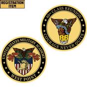 The coin is approximately 2 inches in size and features the 1986 class crest on one side and the USMA crest on the other side.