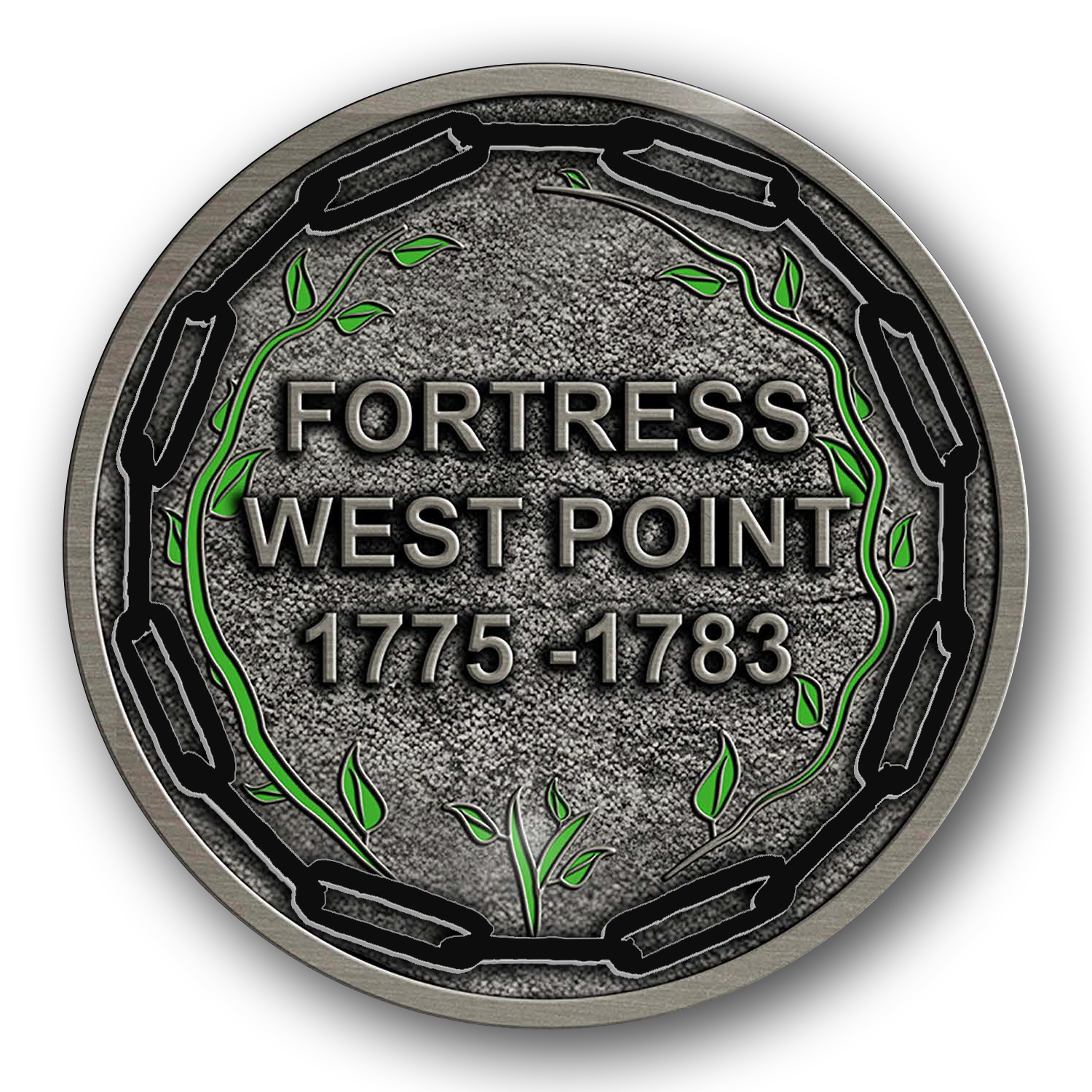 This 1.75 inch coin pays tribute to a button from the Revolutionary War found at Fort Wyllis on one side and Fortress West Point etched in stone on the other.