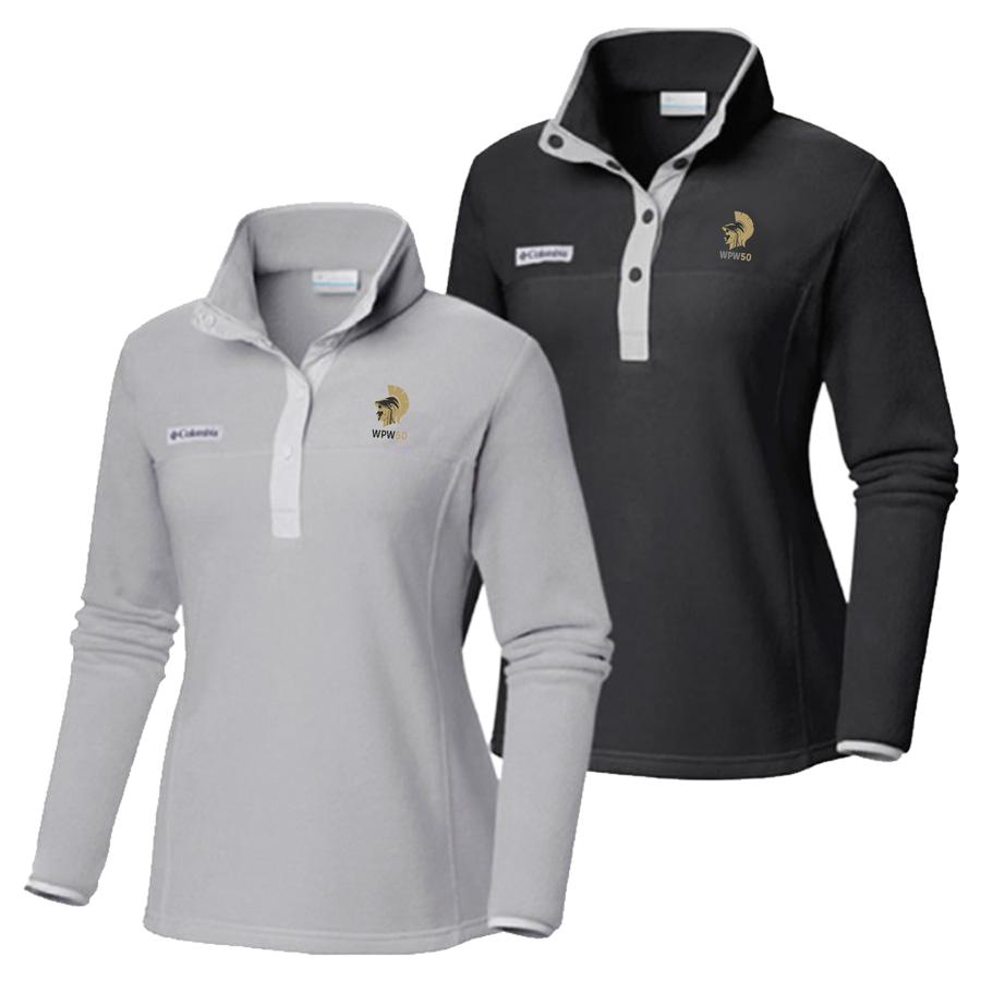 For those with an active lifestyle that like a casual, sporty look, this pullover is for you. Machine wash polyester fleece that is both lightweight and warm in the traditional Columbia fleece fabric that made them so famous. The snap front allows for quick adjustment when hiking or even just sitting in the stands watching your favorite Army sport. Tipped binding at cuff and collar for a finished look. Sizes XS-Xl in a style adorned with the WPW50 Athena and celebratory banner.