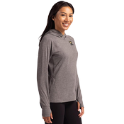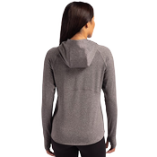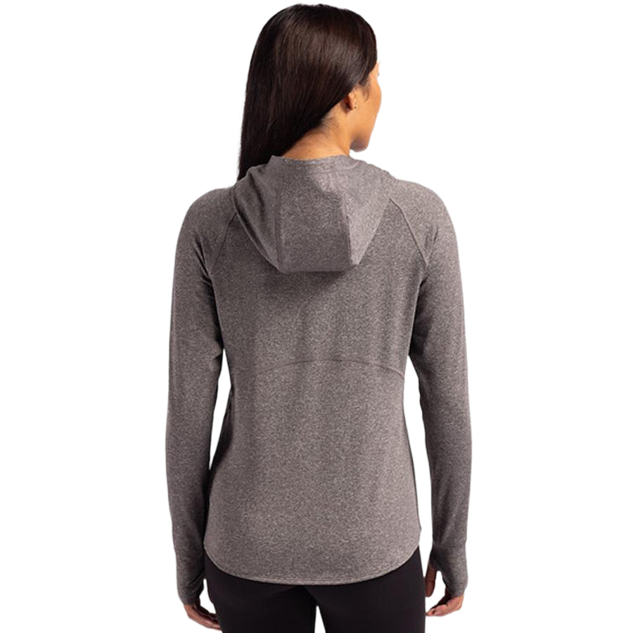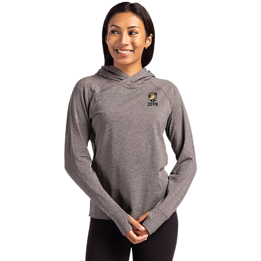 Raglan sleeves with thumbholes in a ladies' hoodie fit.