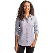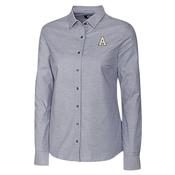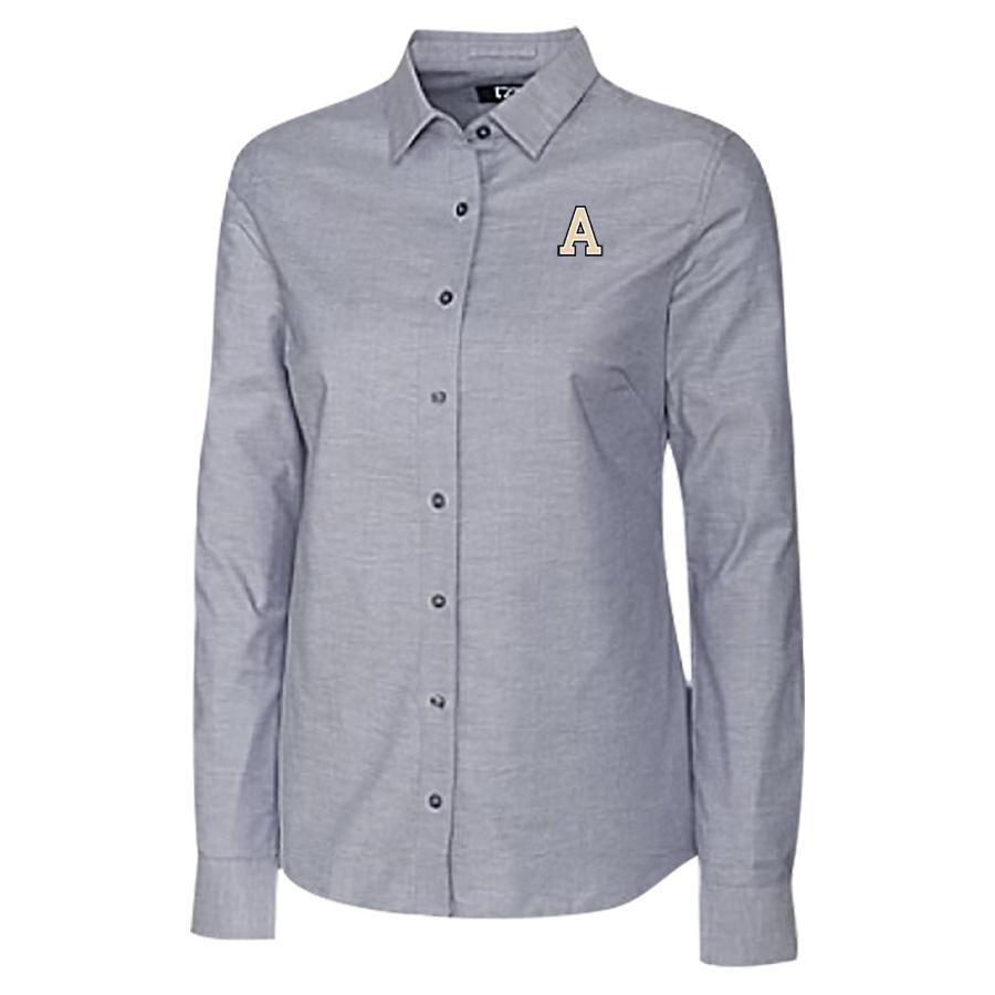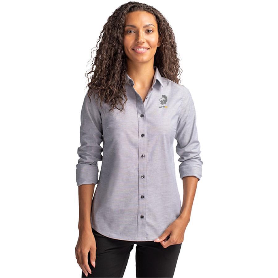 Our Cutter and Buck classic oxford long sleeve shirt in a charcoal color. This shirt is made of a cotton/ polyester blend with just enough Spandex to give it some stretch to move with you. Fabric has a crisp, wrinkle-free finish without PFAS or PVCs. Machine washable easy care style meant to look great right out of the dryer. Feels like cotton. Sizes XS-3XL which translate to Sizes 2-22 in a tailored fit. Art is Athena over the 50th Anniversary celebration banner. Also available with Classic A. Minimum needed to full order is 24 sold mixed with all full button styles with the same art.