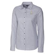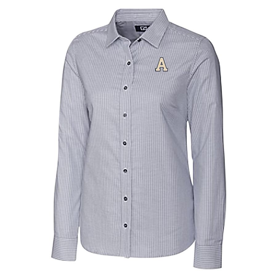 Our Cutter and Buck classic oxford stripe long sleeve shirt is perfect for busy days. This shirt is made of a cotton/polyester blend with just enough Spandex to give it some stretch to move with you. Fabric has a wrinkle-free finish without PFAS or PVCs. Machine washable easy care style meant to look great right out of the dryer. Feels like cotton. Sizes XS-3XL which translate to Sizes 2-22 in a tailored fit. Art is Athena over the 50th Anniversary celebration banner. Also available with Classic A. Minimum needed to place order is 24 sold mixed with all full button styles with the same art.