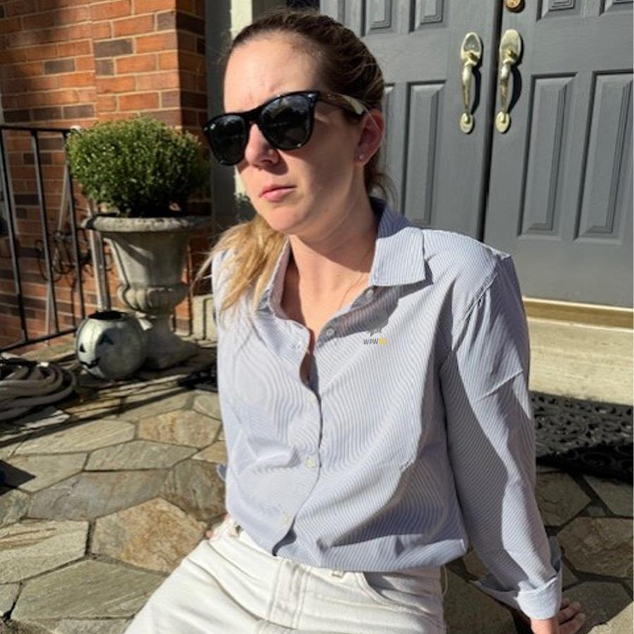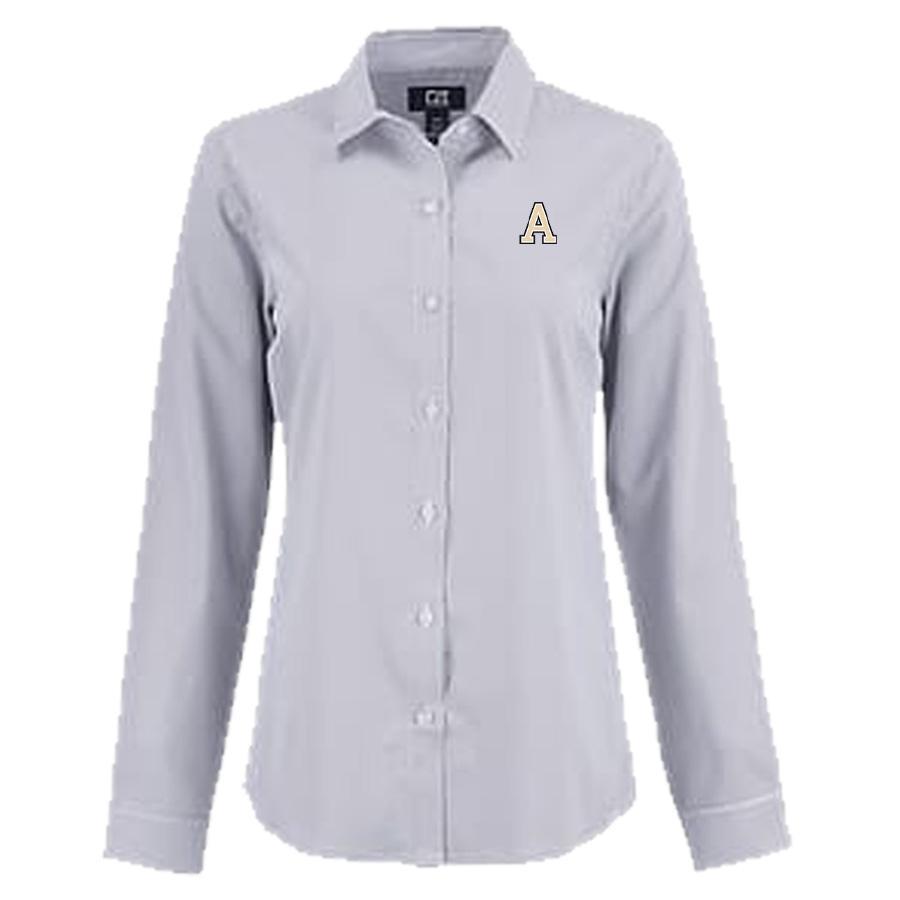 Our Cutter and Buck pinstripe long sleeve shirts work at home or the office. This shirt is made of recycled polyester with just enough Spandex to give it some stretch to move with you throughout the day. Fabric is moisture-wicking, PFAS-stain free resistant, lightweight and breathable. Feels like silk, without all the hassle of dry cleaning. Machine washable with button-down collar and barrel cuffs. Sizes XS-3XL which translate to Sizes 2-22 in a tailored fit. Art is Athena over the 50th Anniversary celebration banner. Also available with Classic A. Minimum needed to place order is 24 sold mixed with all full button styles with the same art. Model is 5'7' and wearing a size medium. She wears a size 6 in pants and a 4 or 6 in tops (Small/Medium). This shirt is tailored so consider ordering a size up if you prefer a loose fit.