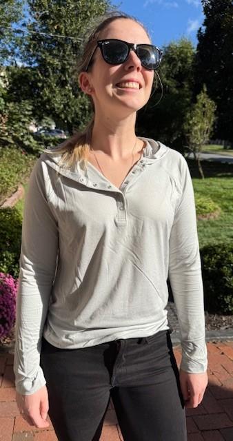 Full size exceptionally soft hooded t-shirt perfect for those with an active lifestyle. Lightweight, breathable double-peached stretch performance jersey that feels airy and weightless on the body. Made from recycled polyester with Spandex. Snap front. Ideal sun protective layer in an easy wash style. Looks great right out of the dryer. Sizes S-3XL which equates to sizes 4-22. Minimum needed to place order is 24 sold mixed with the other CB women's sizes with same art. Model is 5'7' and wearing a size medium. She typically wears a size 6 in pants and a 4 or 6 in tops (Small/Medium). This shirt is relaxed and model could wear a small for a more fitted look.