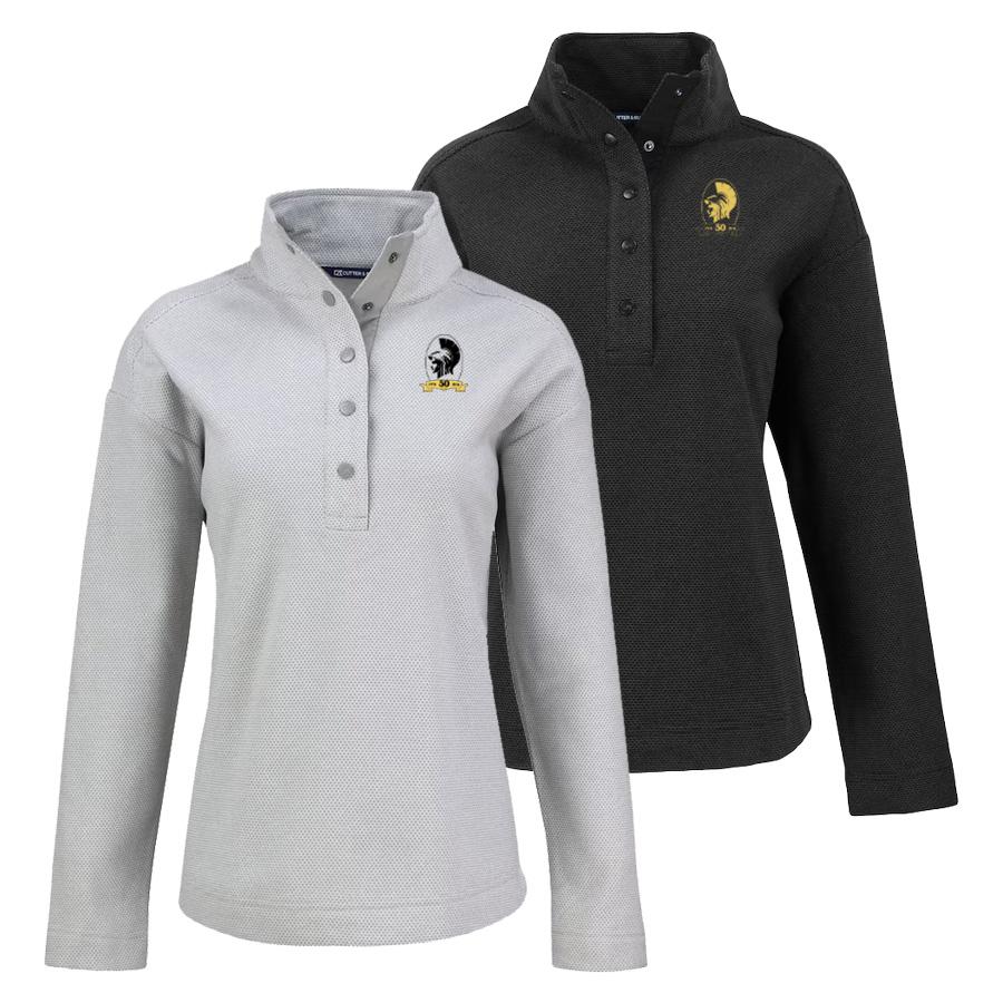 Full size textured fleece pullover with superior moisture wicking breathable comfort. Soft, jacquard textured fleece with thermo-regulation technology that looks and feels great. Made from 100% recycled polyester. Snap placket closure. Machine wash style. Sizes XL-3XL which equates to sizes 16-22. Minimum needed to place order is 24 sold mixed with the other CB women's sizes with same art. Model is 5'2' and wearing a size large which is her typical size.