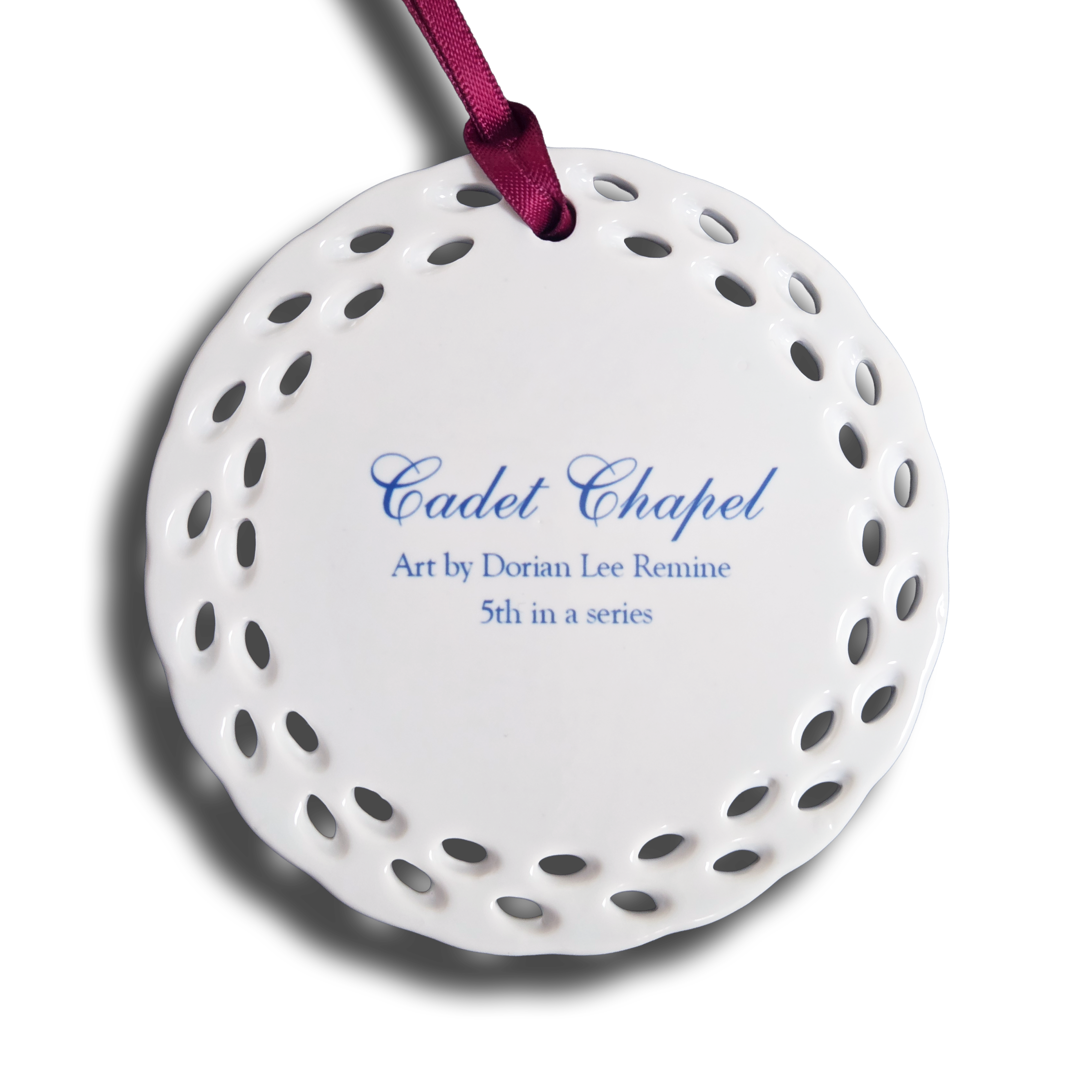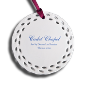 The Cadet Chapel ornament is the fifth in our Watercolor ornament series by award winning artist, Dorian Lee Remine. Dorian's art has graced the walls and Christmas trees of graduates, parents and supporters for decades. Round ceramic ornament with ribbon. New for 2024.