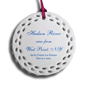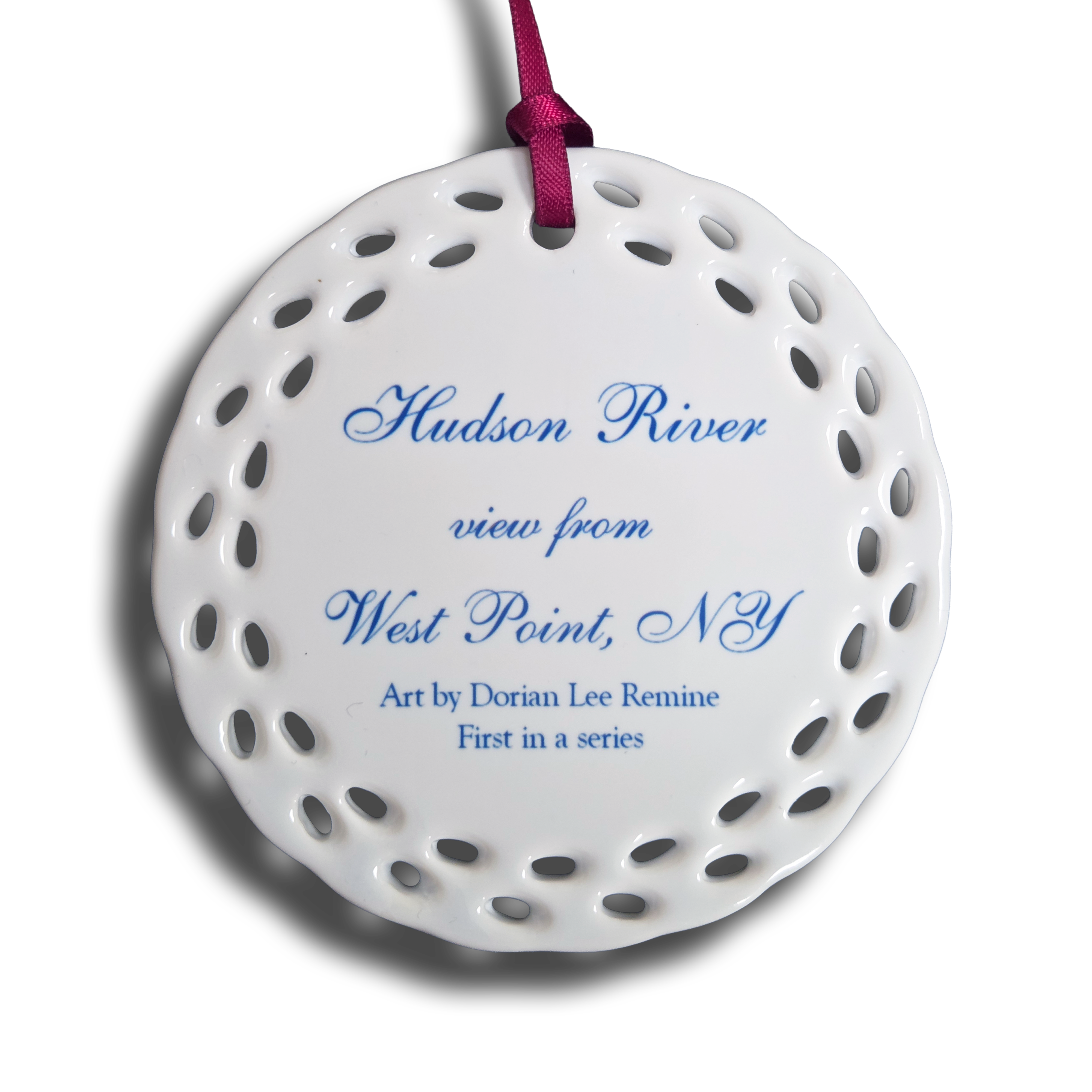 This is the first in a watercolor series of ceramic ornaments by award-winning artist, Dorian Lee Remine. The ornament features a beautiful view of the Hudson River, as seen looking north from Trophy Point. Round with bow for hanging.