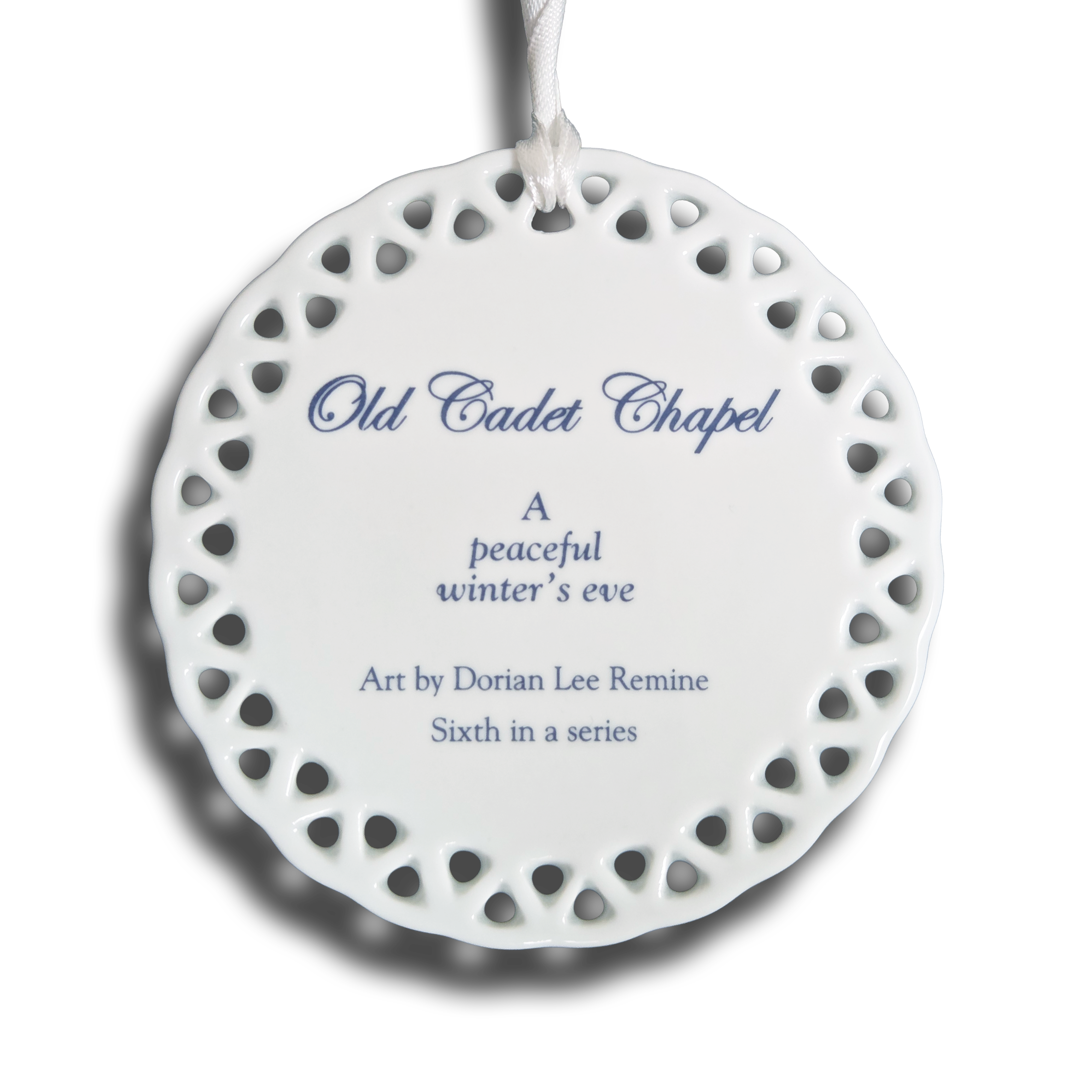 Our latest design from artist Dorian Remine features the Old Cadet Chapel on a winter's night. This ornament is number 6 in the series and is porcelain with 22K gold accents.