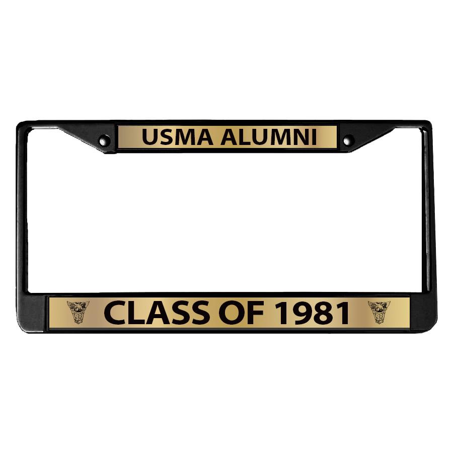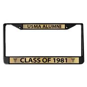 Full color metal license plate frame in black with gold enamel. Class of 1981 across the bottom with USMA Alumni at top. Class crests on either side at bottom. Available as a pre-order only ahead of the class reunion in 2026. Minimum to place order is 24 pc sold. Please select ship to at check out as all gear will ship ahead of the event. Class gear is a final sale, so please call the store if you have any questions before ordering (800-426-4725).