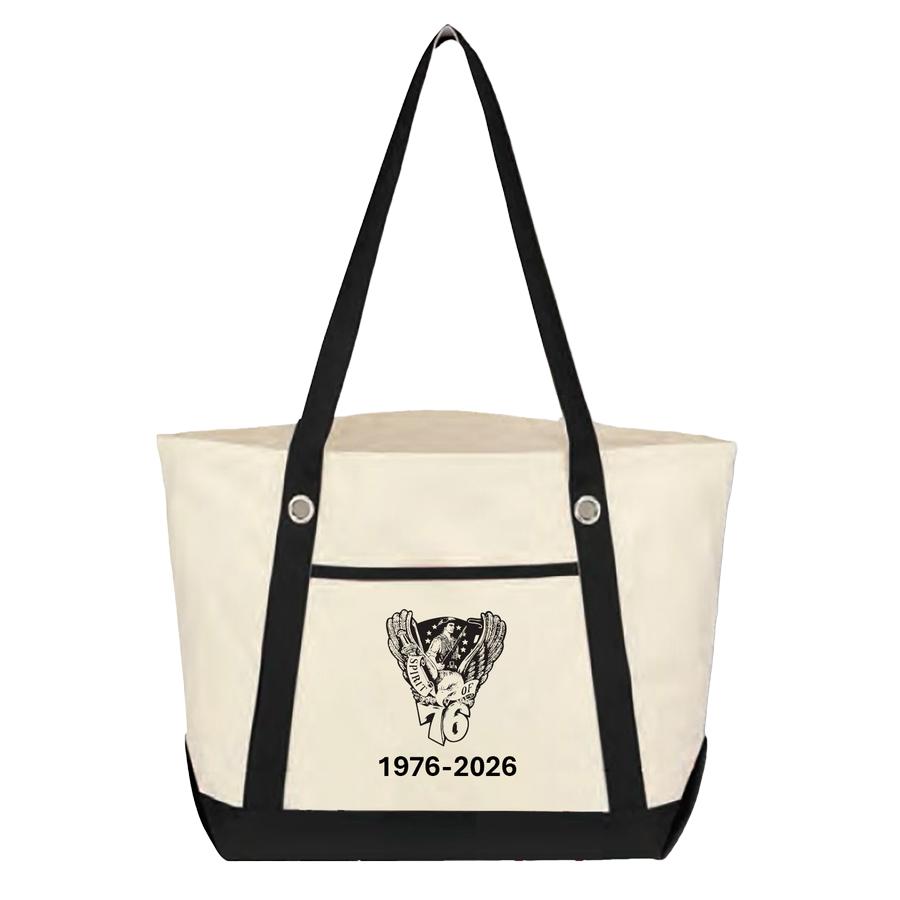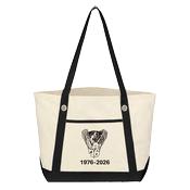 A canvas tote in a traditional style. Cotton with black handles and bottom. Handles are 27 inches. Bag measures 20.5 W x 13 H x 7 D. Open top style. Art is class crest over 1976-2026.