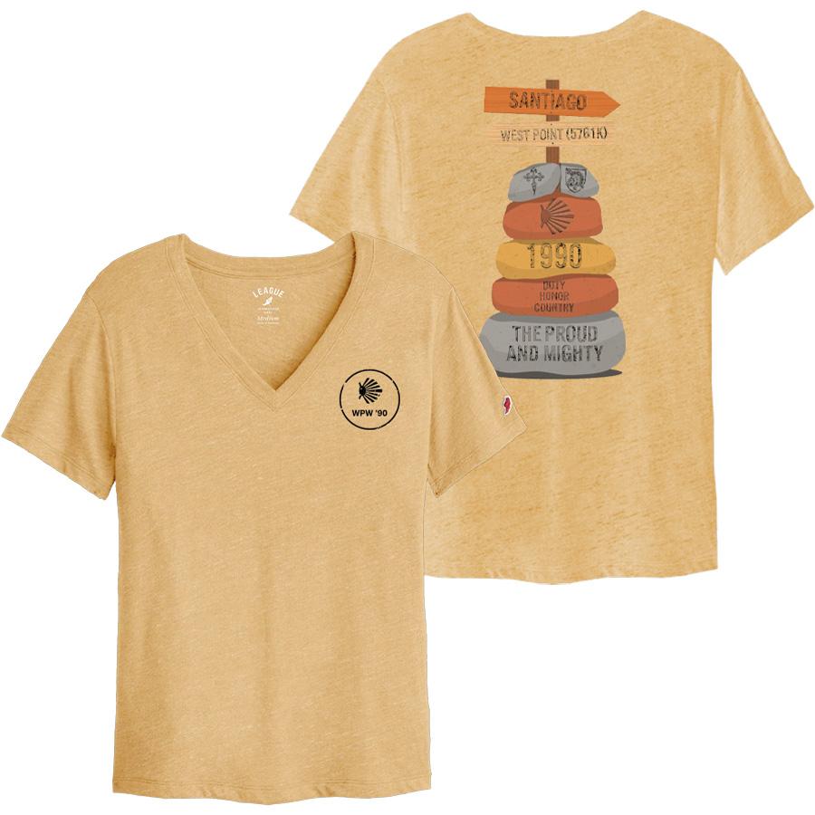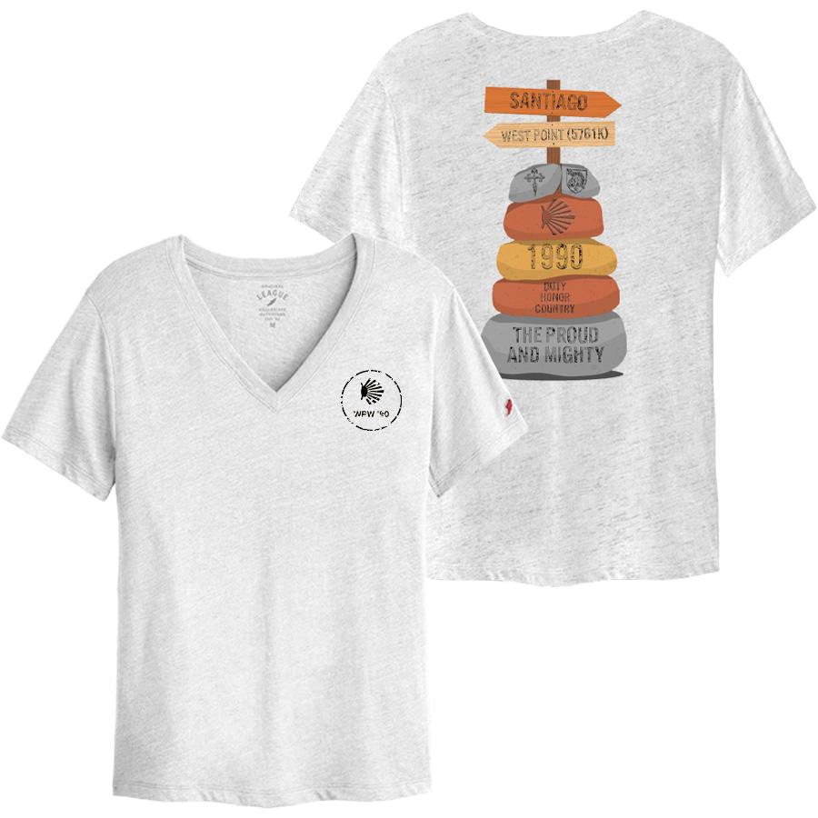 A special order for a special trip. Classic fit, V-neck t-shirt in a soft, tri-blend fabric. Design is custom for Class of 1990's Camino trip in 2026. Also available in heather gray up to size 2XL (G48490). Crew styles are G48490 and G484C90. SIzes S-XL. Minimum needed to place order is 24 shirts combined with crew style.