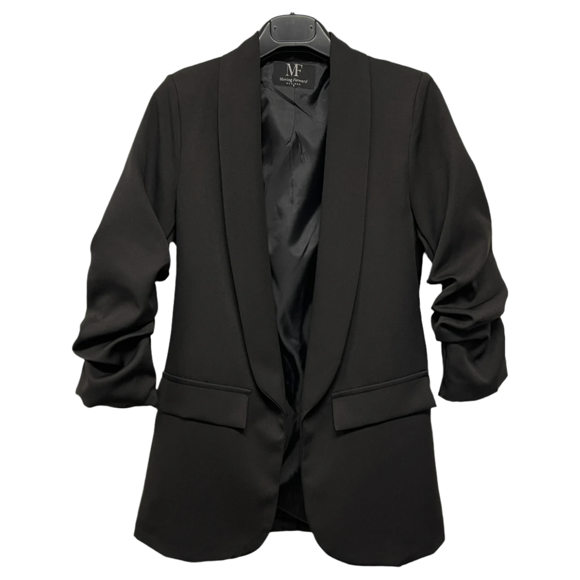 The sleeves are ruched for a modern look and a sleeve length anyone can wear without alterations.