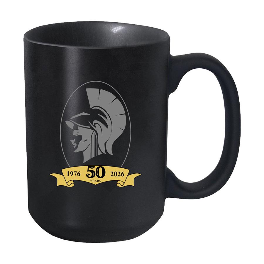 A black matte ceramic mug with the West Point Women's Athena design. Holds 15 ounces. Hand wash. Minimum needed to place the mug order is 48 sold.