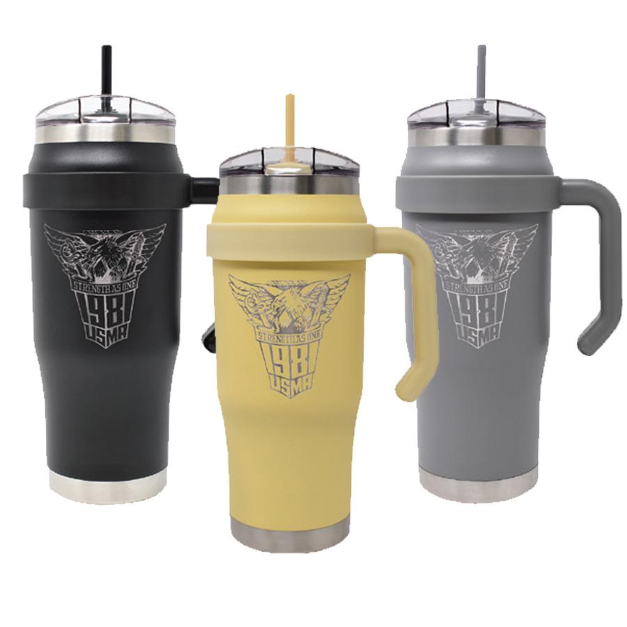 A travel mug that features the 1981 crest laser etched on the front. Stainless steel, vacuum insulated to keep drinks hot or cold. Optional straw use or sip directly from the lid. Holds 32 ounces. Powder coated for a durable finish. Minimum needed to place order is 24 sold mixed with all 3 colors.