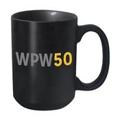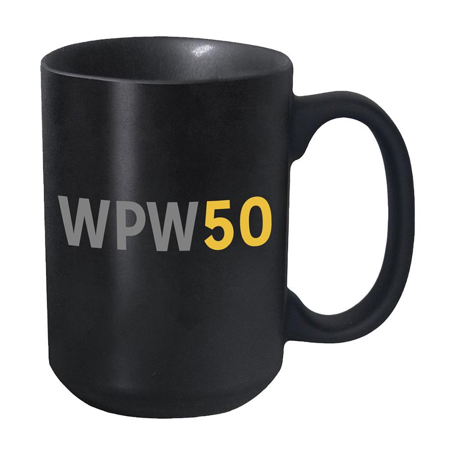 A black matte ceramic mug with the WPW50 design. Holds 15 ounces. Hand wash. Minimum needed to place the mug order is 48 sold.