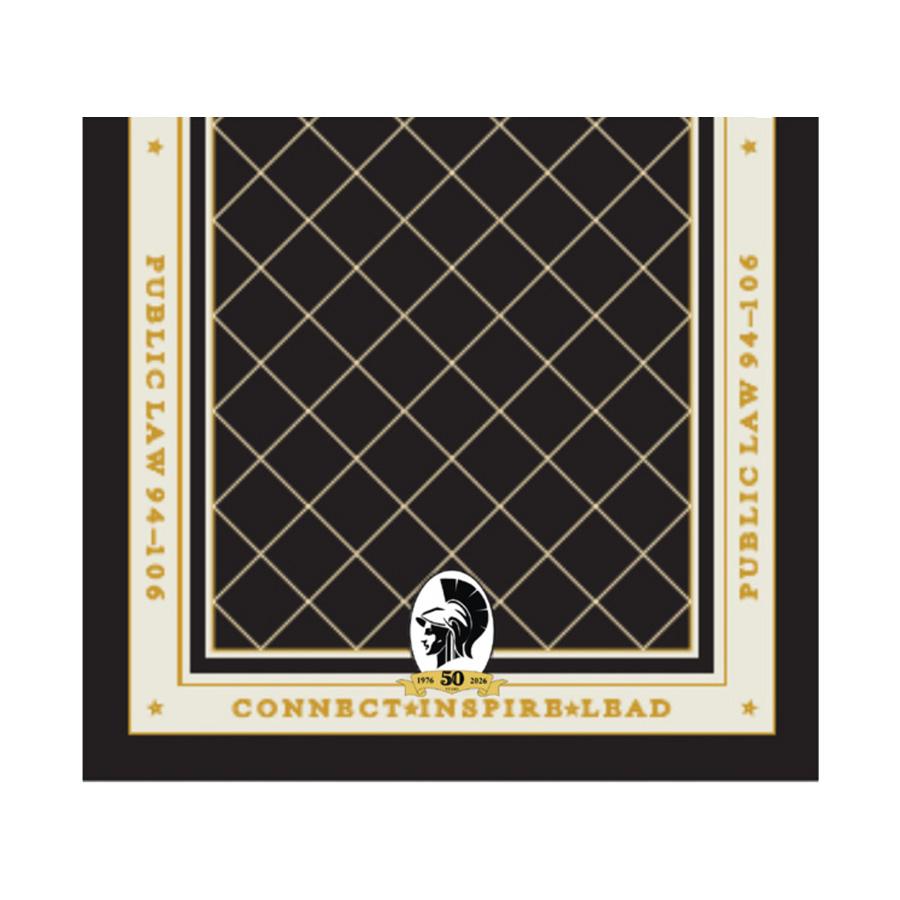 A gorgeous silk scarf designed exclusively for the 50 Year celebration of women at West Point. The scarf contains the public law allowing women to attend academies, the inspirational WPW50 slogan, and other great details in a grid pattern. Oblong scarves are a versatile addition to any wardrobe. Measures 11 x54 inches. The model is wearing a sample version of this scarf. Please note that the image is slightly different with the Athena being incased in a gold background to match the border on the scarf. All custom orders are final sale.