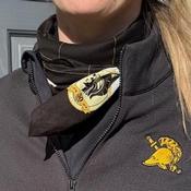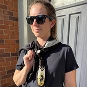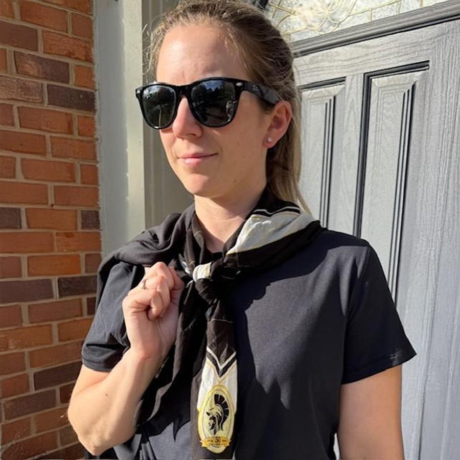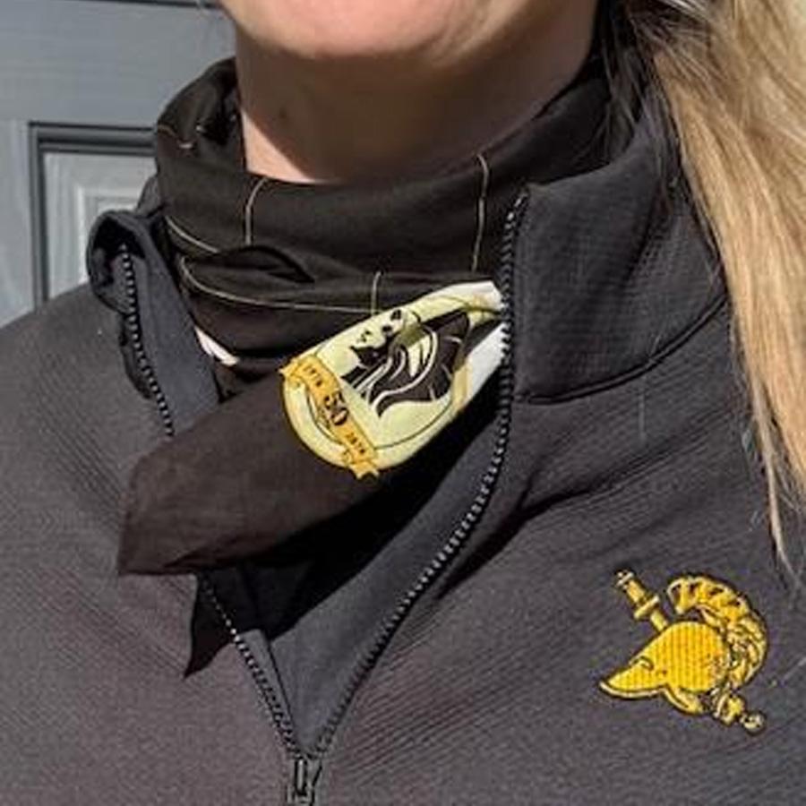 A versatile cotton scarf designed exclusively for the 50 Year celebration of women at West Point. The scarf contains important dates around the border including the date the public law was signed allowing women to attend academies and the date women first arrived at West Point. The Athena with banner celebration logo is at each corner of this great style. Own a piece of history that can be worn again and again. A standard 35 inch square. The model is wearing a sample version. The scarf will be in regular stock through Spring 2026.