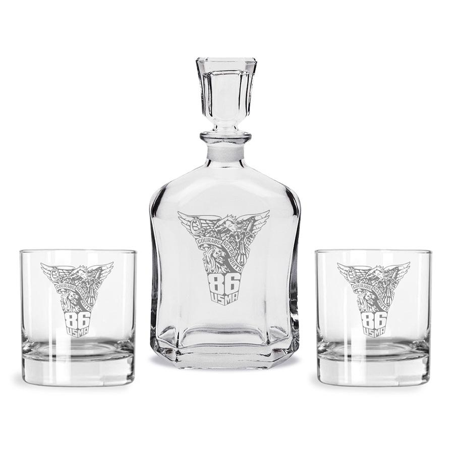 Art is the class crest etched on the decanter and glasses.