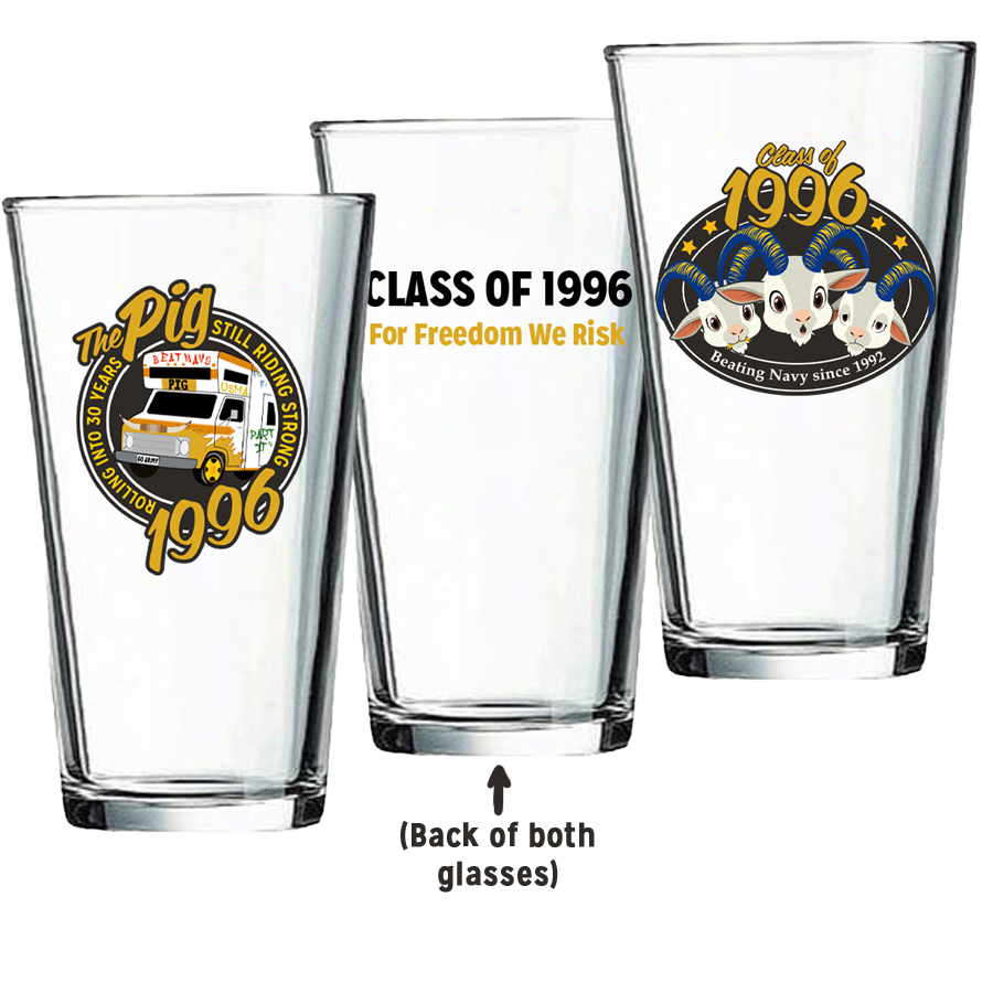 Celebrate your milestone reunion with a walk down memory lane. Nothing says success like 4 wins over Navy! This glass set features two 16 oz pub glasses. Glass 1 features a tribute to The Pig. Glass 2 is a reminder of your class spirit mission and wins over Navy. Also available in rocks glasses (R00596). Please hand wash for best results.