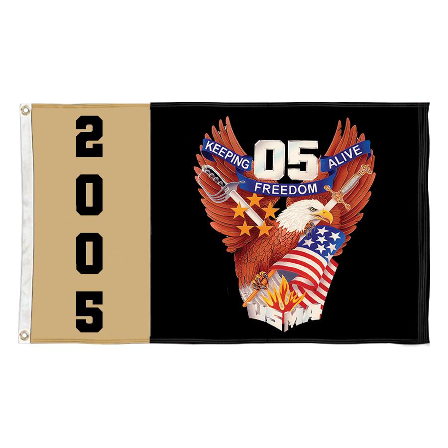 Single-sided flag with grommets meant to be used on a flag pole. Measures 3x5 feet. Back is reverse of front like a traditional US Flag. If you want a design double-sided and heavy, consider the banner instead. This style is single-sided to flow in the wind.