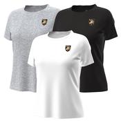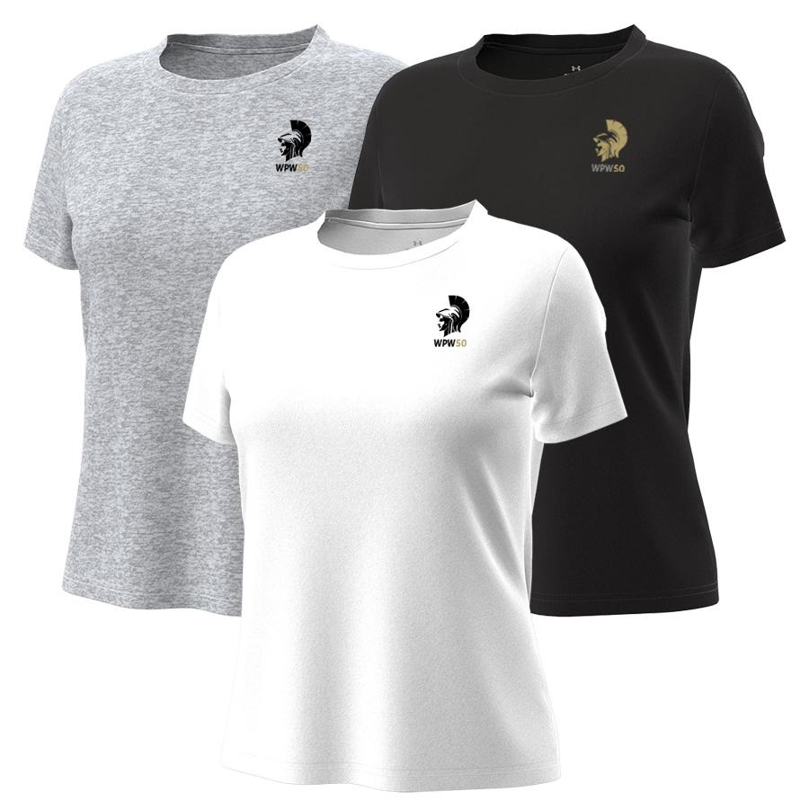 This Under Armour crew t-shirt is a classic fit for those that prefer their tees a little tailored. Soft, performance fabric that feels smooth like cotton, but offers breathable comfort and easy care. Machine wash in 3 color choices. Art is screened on left chest. Sizes XS-2XL. Minimum need to place order is 24 sold mixed with all UA styles with the same art. Model is 5'7' and wearing a size medium. She typically wears a size 6 in pants and a 4 or 6 in tops (Small/Medium). This shirt is a classic fit, so no need to size up.