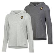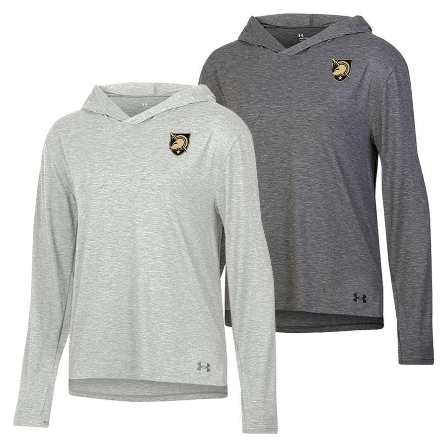 Under Armour loose, ultra soft, long sleeve hooded t-shirt in a breathable fabric. Moisture wicking with quick-dry qualities makes this a great work our piece. Machine wash this print art style. Fuller cut style in sizes XS-2XL. Minimum need to place order is 24 sold mixed with all UA styles with the same art. Model is 5'7' and wearing a size medium. She typically wears a size 6 in pants and a 4 or 6 in tops (Small/Medium). This shirt is a loose fit and model would purchase a small.